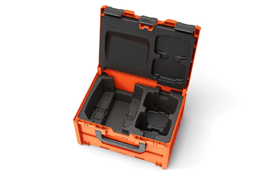 Deska k uchycení boxu na akumulátory Husqvarna je odolná a přitom lehká a lze ji namontovat přímo na polici v pracovním vozidle. Deska je vybavena bezpečnostními zámky, které zabraňují posunutí boxů během přepravy. Je kompatibilní s několika běžnými regálovými systémy.