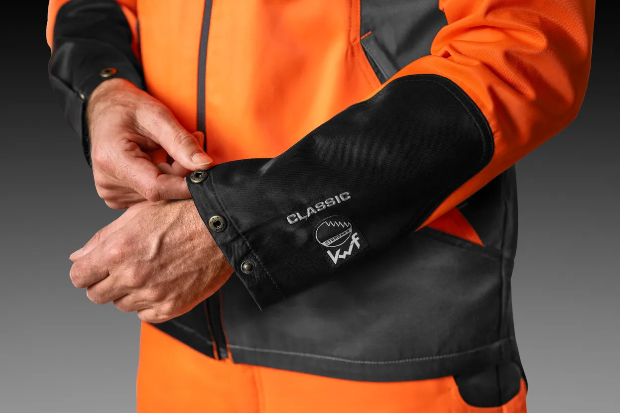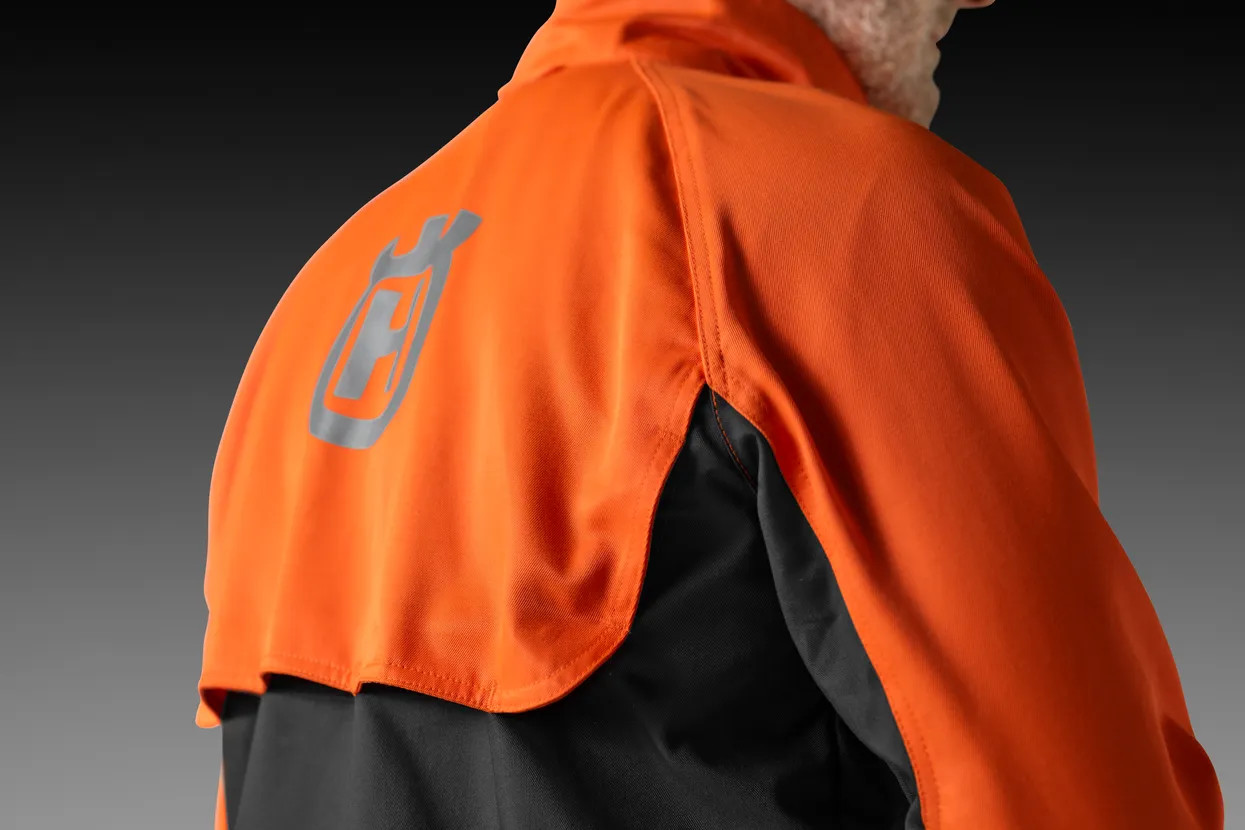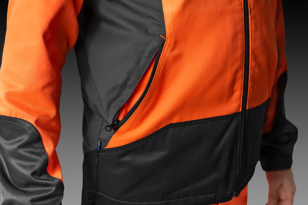 Bunda Husqvarna Classic na práci v lese nabízí základní funkce pro lesnické a venkovní práce. Využívá reflexní barvy a loga, které zvyšují viditelnost venku. Otvory v oblasti ramen zajišťují dobré větrání a pomáhají udržovat příjemnou teplotu během práce. Náprsní kapsa a dvě boční kapsy nabízejí praktické úložiště na věci a cvočky na koncích rukávů umožňují rychlé nastavení i v rukavicích. K dispozici ve velikostech XS–XXL.