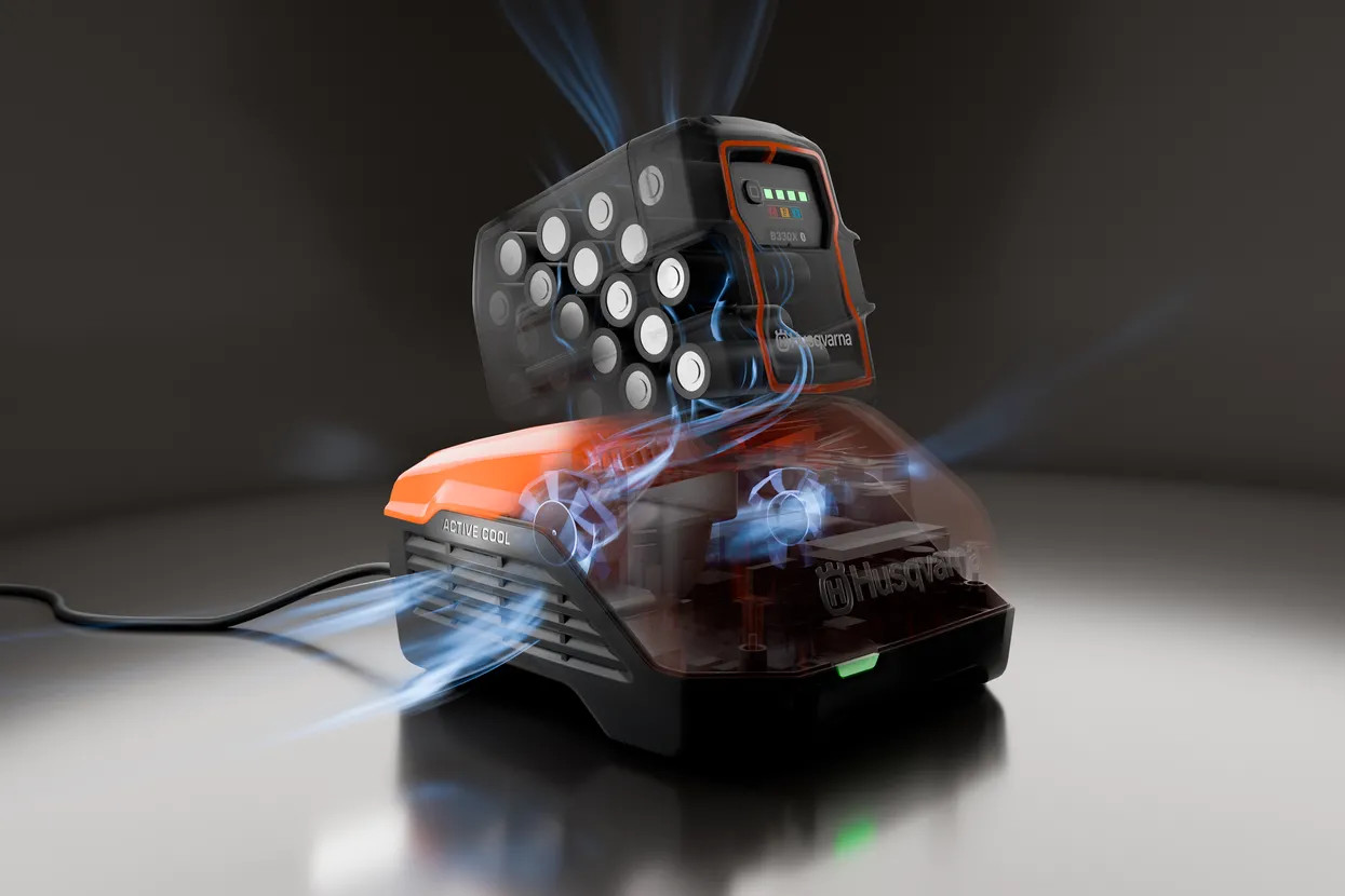 Systém ActiveCool ochlazuje akumulátor během provozu a nabíjení. Akumulátor je vhodný pro použití se službou Husqvarna Fleet Services.