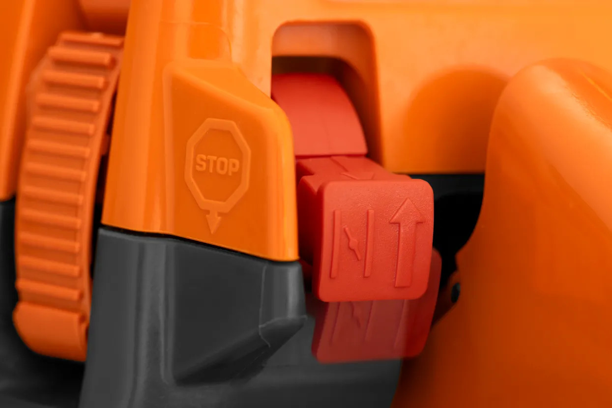 V případě zpětného vrhu účinná brzda řetězu aktivovaná setrvačností okamžitě zastaví řetěz, aby se snížila pravděpodobnost zranění.