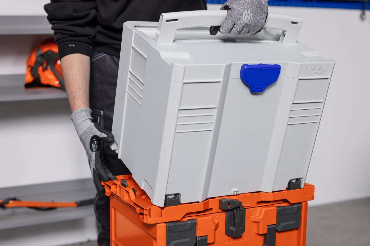 Box Husqvarna na akumulátory lze snadno připojit k některým kufříkovým systémům, dostupným na trhu, pomocí multiadaptérové desky*. *K dispozici jako příslušenství