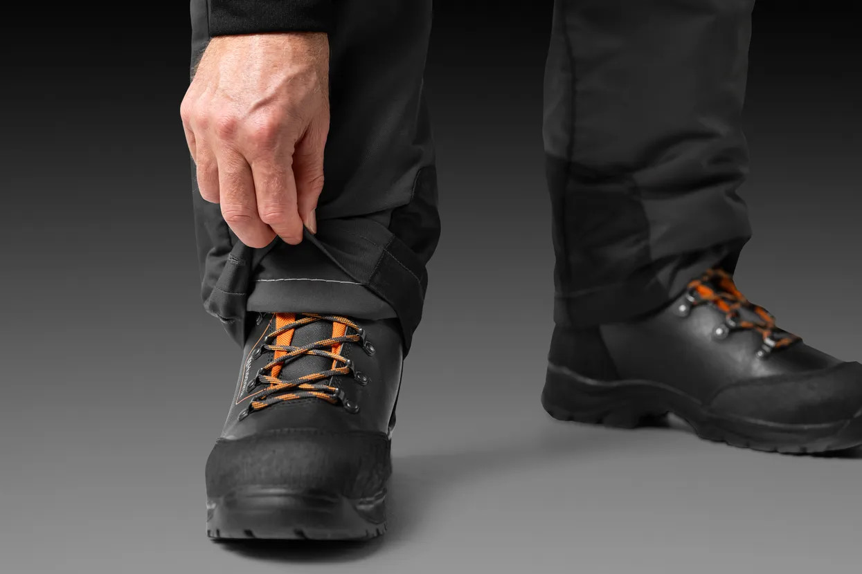 Spodní část ochranné vložky uvnitř kalhot je vyztužena, aby se zabránilo opotřebení protipořezové ochrany a byla zajištěna dlouhodobá odolnost. Vložka protipořezové ochrany je plně krytá, což omezuje riziko, že do materiálu vniknou piliny.